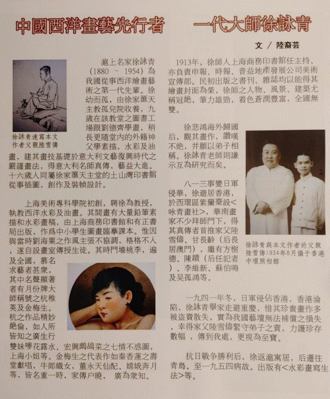 圖文: 陸裔芸 ( 加拿大安省中國美術會常務董事) 這幅素描乃中國第一位西洋畫大師徐詠青,在1934年,在香港設館授徒時,教導我父親之示範畫作品。當時設舘於西環崇蘭臺。 徐詠青素描作品 徐詠青乃滬上,上海人。30年代初,因逃避日本侵華,從上海來到香港,比徐悲鴻還早。徐悲鴻留法返中國,睹其作品, 甘願以其弟子拜稱。 請參考本人舊作「中國西洋畫藝先行者 一代大師徐詠青」一文。 願多些人認識我國之藝壇歷史。 陸裔芸舊作「中國西洋畫藝先行者 一代大師徐詠青」